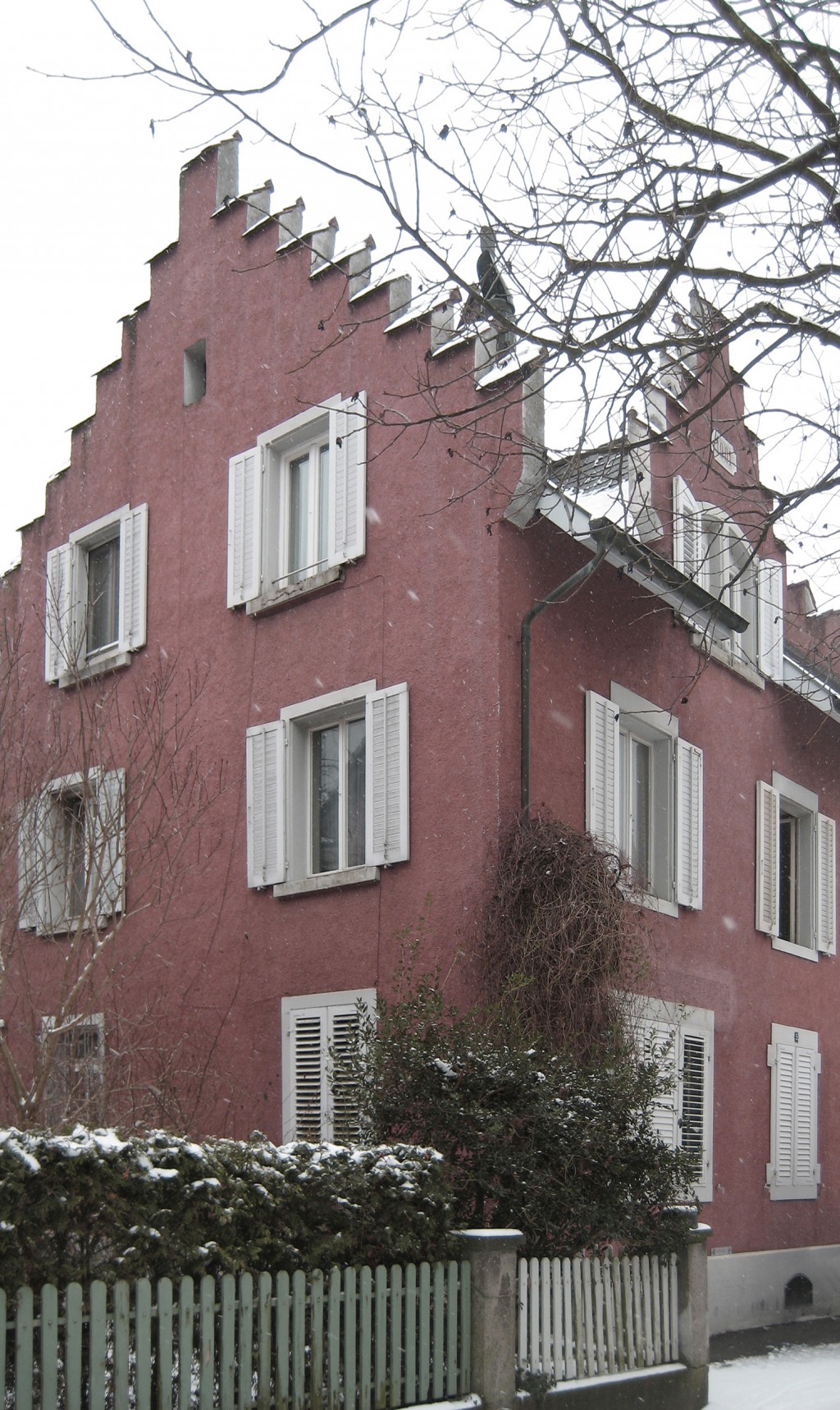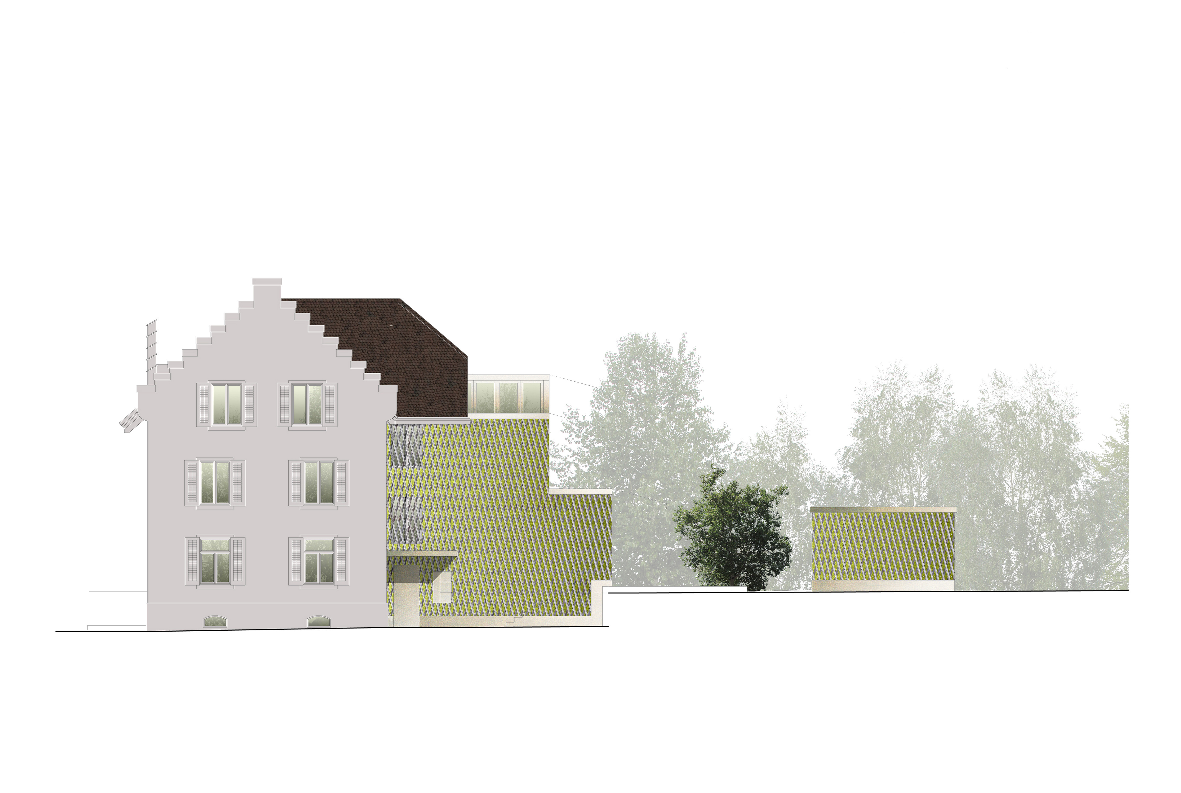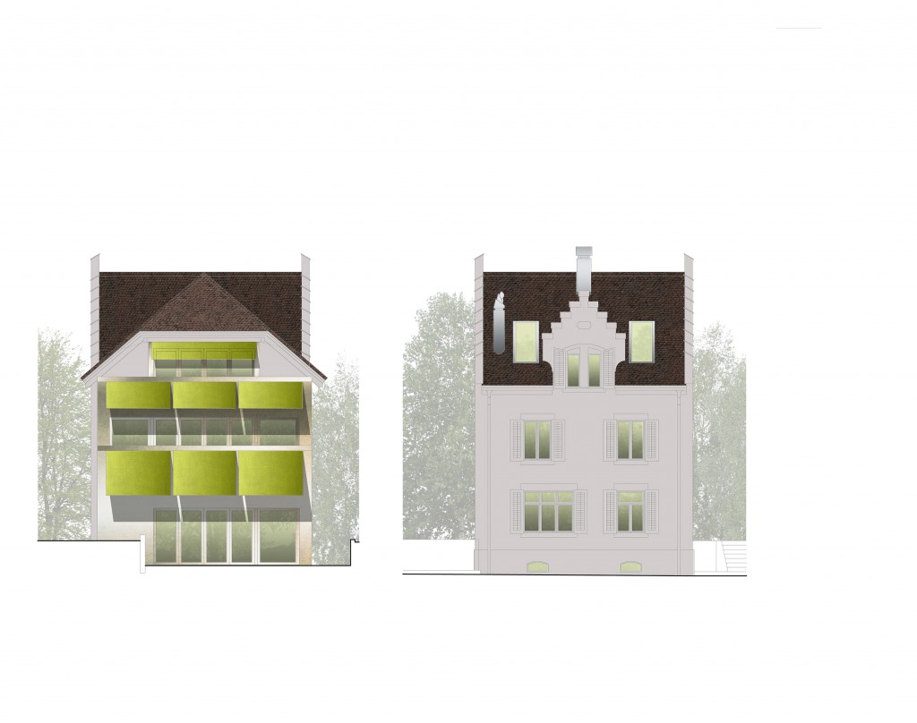 Haus Lägernstrasse Baden Direktauftrag 2010 Umbau und Sanierung eines Mehrfamilienhauses mit bestehenden Werkstattanbau. Neues Layout mit drei Wohnungen. Der Anbau auf der Gartenseite erhält eine Fasssade mit Holzspalieren. Haus Lägernstrasse