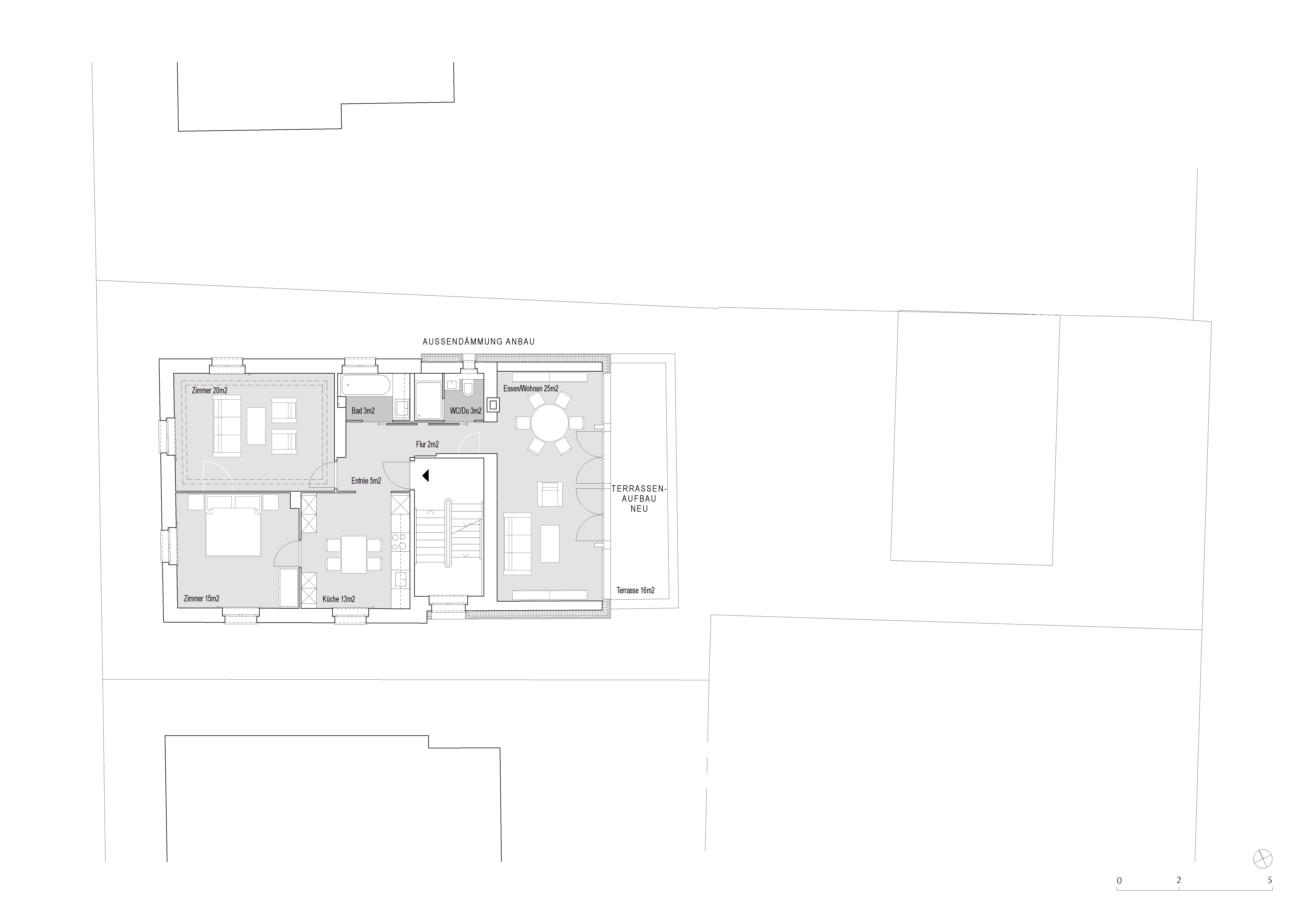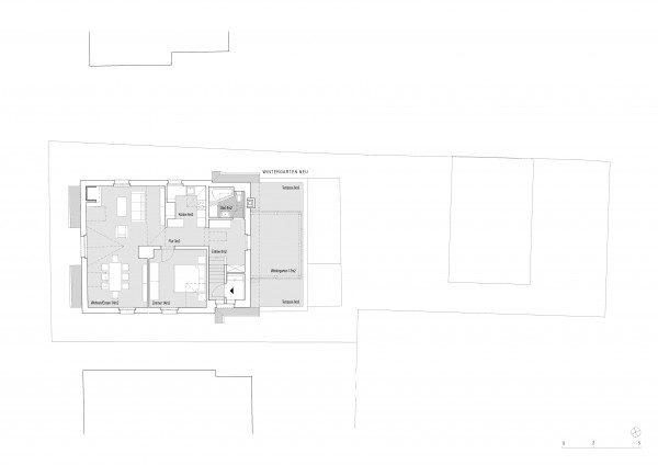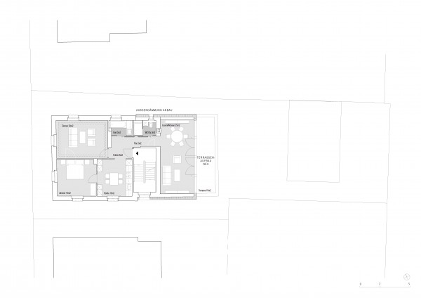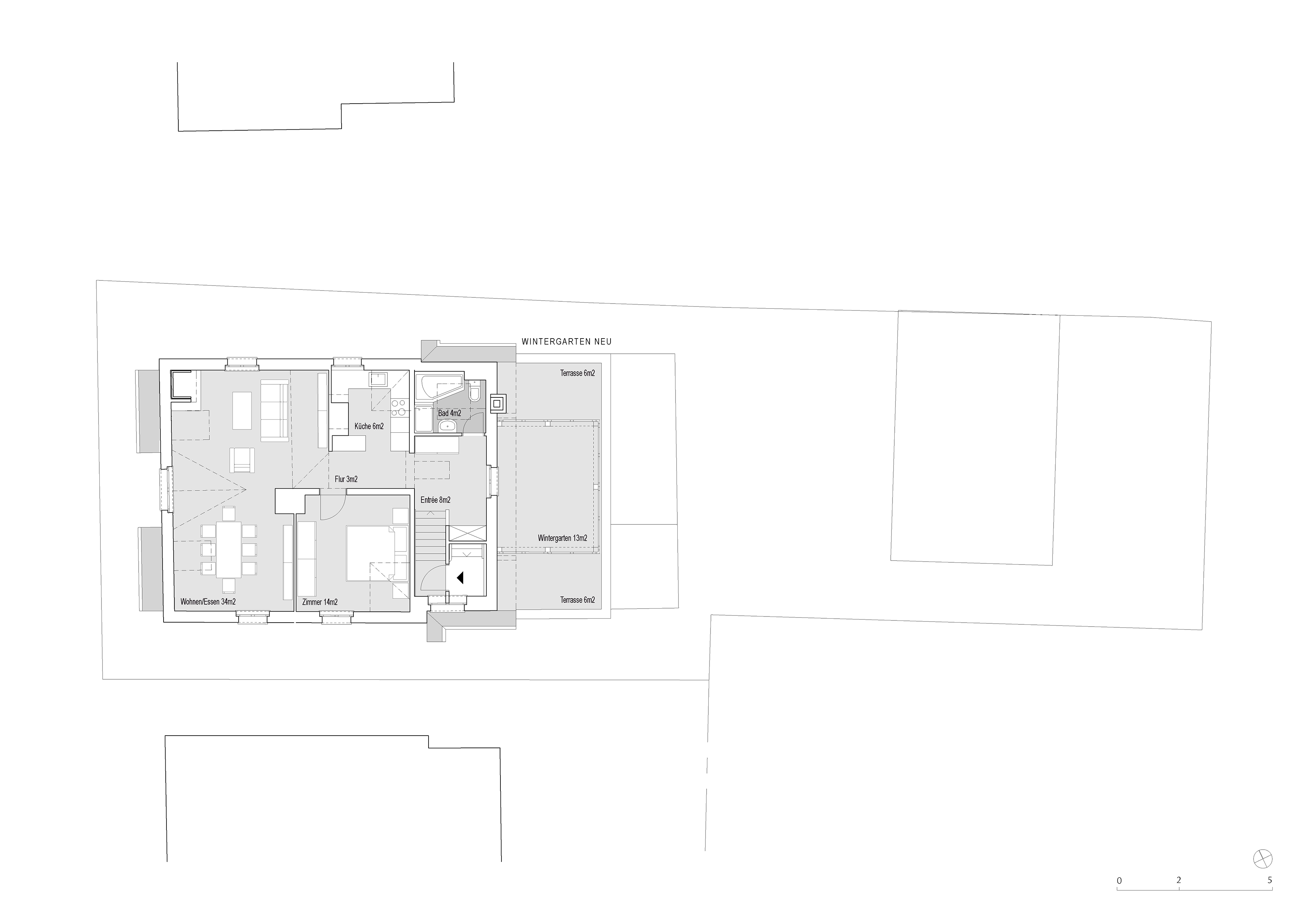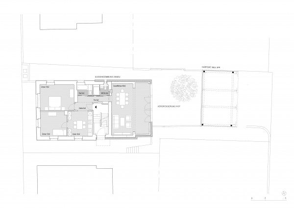 Haus Lägernstrasse Baden Direktauftrag 2010 Umbau und Sanierung eines Mehrfamilienhauses mit bestehenden Werkstattanbau. Neues Layout mit drei Wohnungen. Der Anbau auf der Gartenseite erhält eine Fasssade mit Holzspalieren. Haus Lägernstrasse
