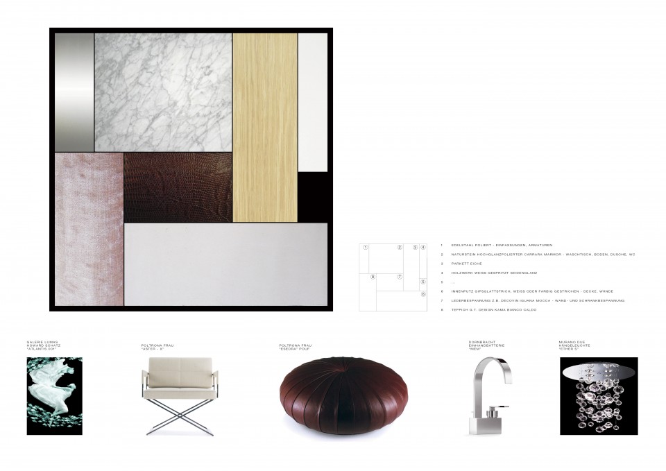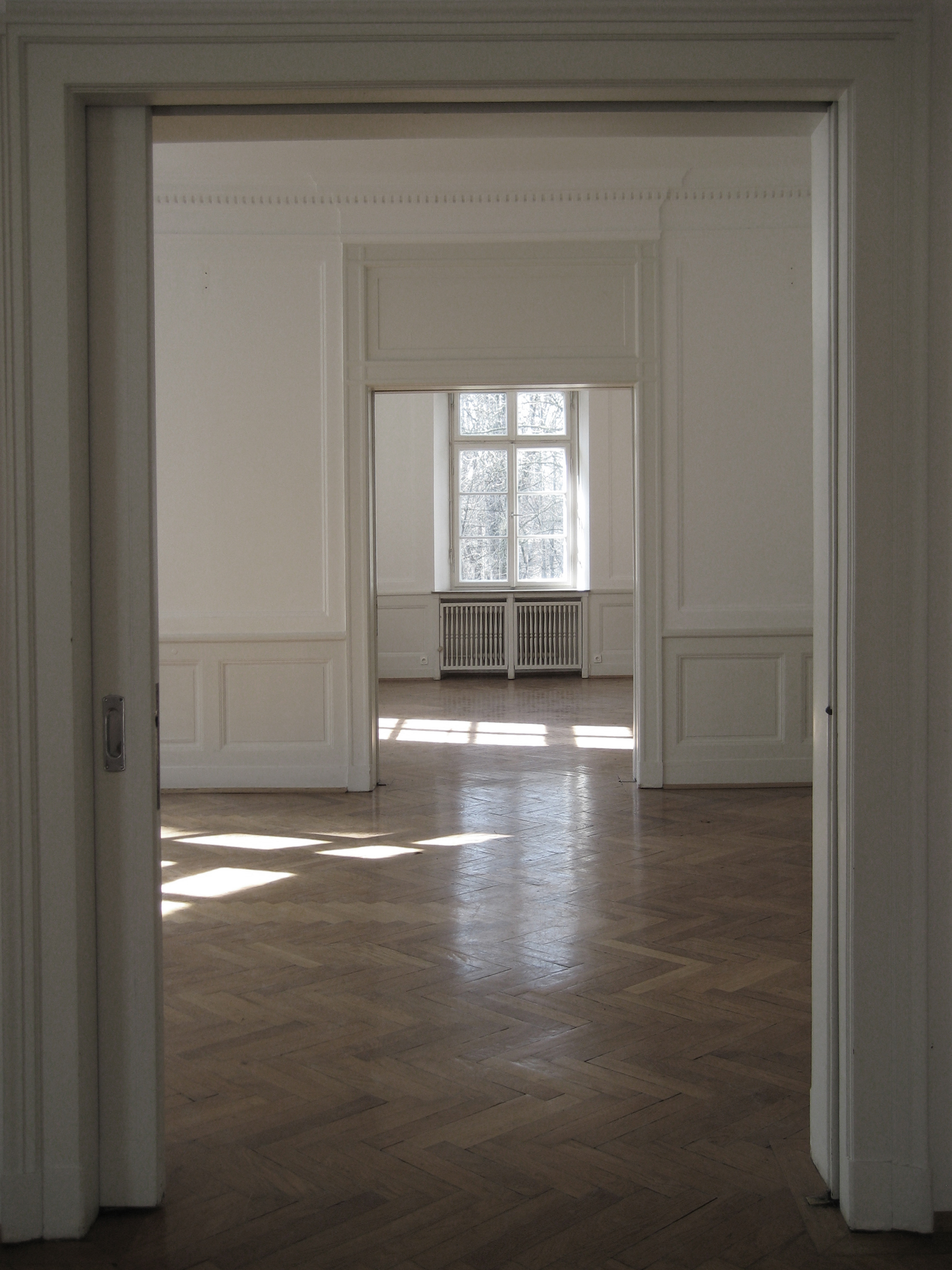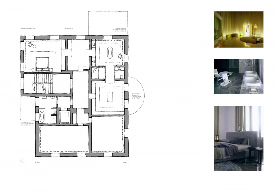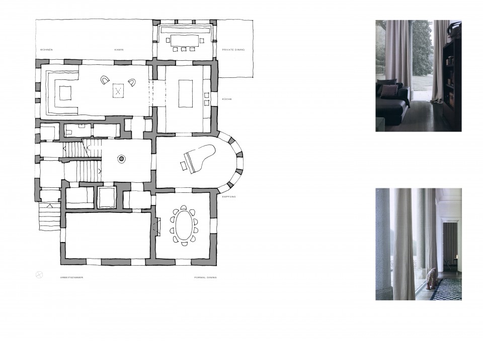 Bei der Villa handelt es sich um ein stattliches Haus an Münchens schönster Stelle, der Isar. Wie in den Bestandsplänen ersichtlich, vermittelt das Haus einen selbstbewussten Charme und zeugt an zahlreichen Stellen – von der Fassade bis zur Türklinke - noch immer von einem lokal verankerten, traditionellen Architekturverständnis seiner Erbauer. Dort, wo die Struktur des Hauses modifiziert wird, entsteht durch die Veränderung ein deutlicher Mehrwert an höherer Funktionalität gleichermassen wie an einer prägnanteren Ästhetik. Besonderes Augenmerk gilt dem Entrée: hier wird durch den Umbau die aus mehreren Kreuzgewölben bestehende Diele zu einem Einstützenraum umgedeutet. Grundsätzlich ist der Decke und dem Boden eine hohe Priorität einzuräumen, da diese Bauteile die räumliche Struktur nochmals nachzuzeichnen vermögen mittels Deckenfriesen und Rosetten beziehungsweise Entharsien und Parkettlinien im Falle der Böden. Aufbauend auf dem Charakter des Altbaus werden die Räume bereinigt und präzise Zimmerformen geschaffen. Die Zimmer sind mittels Enfiladen miteinander verbunden. Die Analogie einer Perlenkette ist hier anschaulich: wie Perle an Perle wird auch hier Zimmer an Zimmer geknüpft. Dabei sind die Zimmer in einer reinen Form herausgearbeitet, gleichsam einer Perle. Im weiteren wird eine Dramaturgie von grossen Zimmern – Masterbedroom, Ankleiden – zu kleinteiligen Räumen wie dem Mastervorzimmer, Dusche und WC etabliert. Die dabei entstehenden Phänomene wie Enge und Weite sind reizvoll und führen zum eigentlichen Ziel: Dichte.